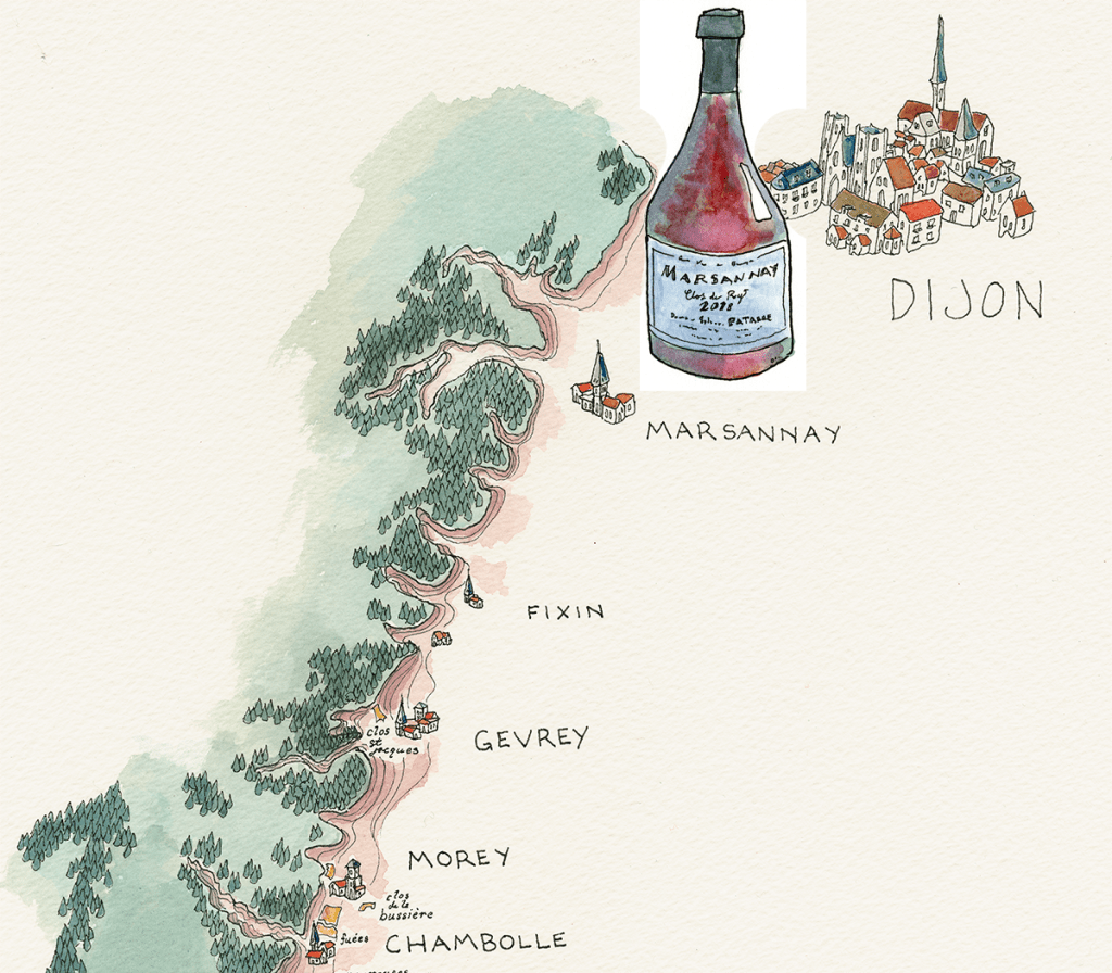 Out of what? Pinot noir in the northernmost named site in Marsannay, “Le Clos des Ducs”, renamed “Clos du Roy” after Duke Charles the Bold’s defeat at Nancy in 1477 by the French crown, on reddish, iron-rich soil, 100% whole cluster.