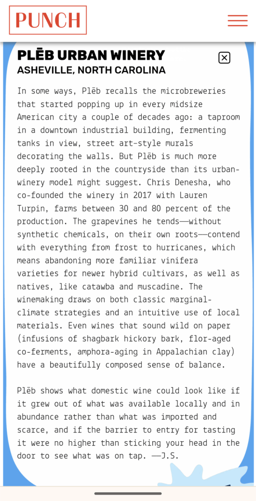 - The wines we tasted were made across a wide spectrum of style, from straightforward (“white”, “red”) to decidedly more esoteric (“co-ferment aged under flor on foraged hickory shag bark”, “oxidative solera”). Which of these wines felt more classic? Which were more challenging? Did your opinion change with food, air, or time?