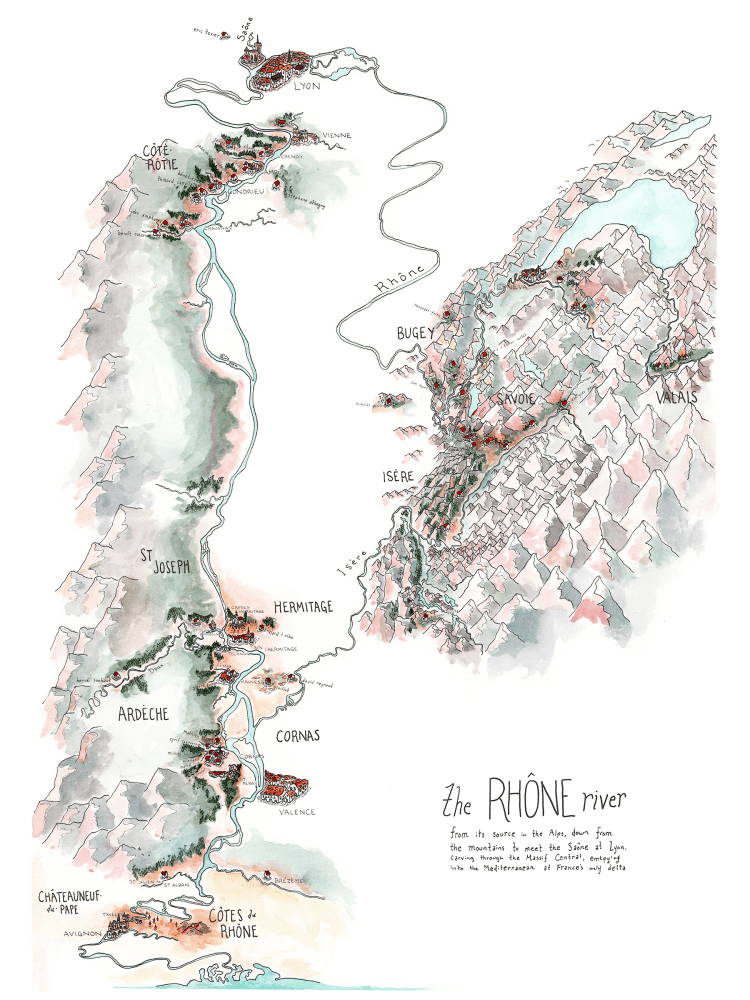 But rivers invite continuity. They flow, they rush, they let us go tubing from one place to another. The Rhône doesn’t begin with Côte-Rôtie or end with Châteauneuf. It’s born in Alpine glaciers, and it ends in a delta that mingles with the Mediterranean.