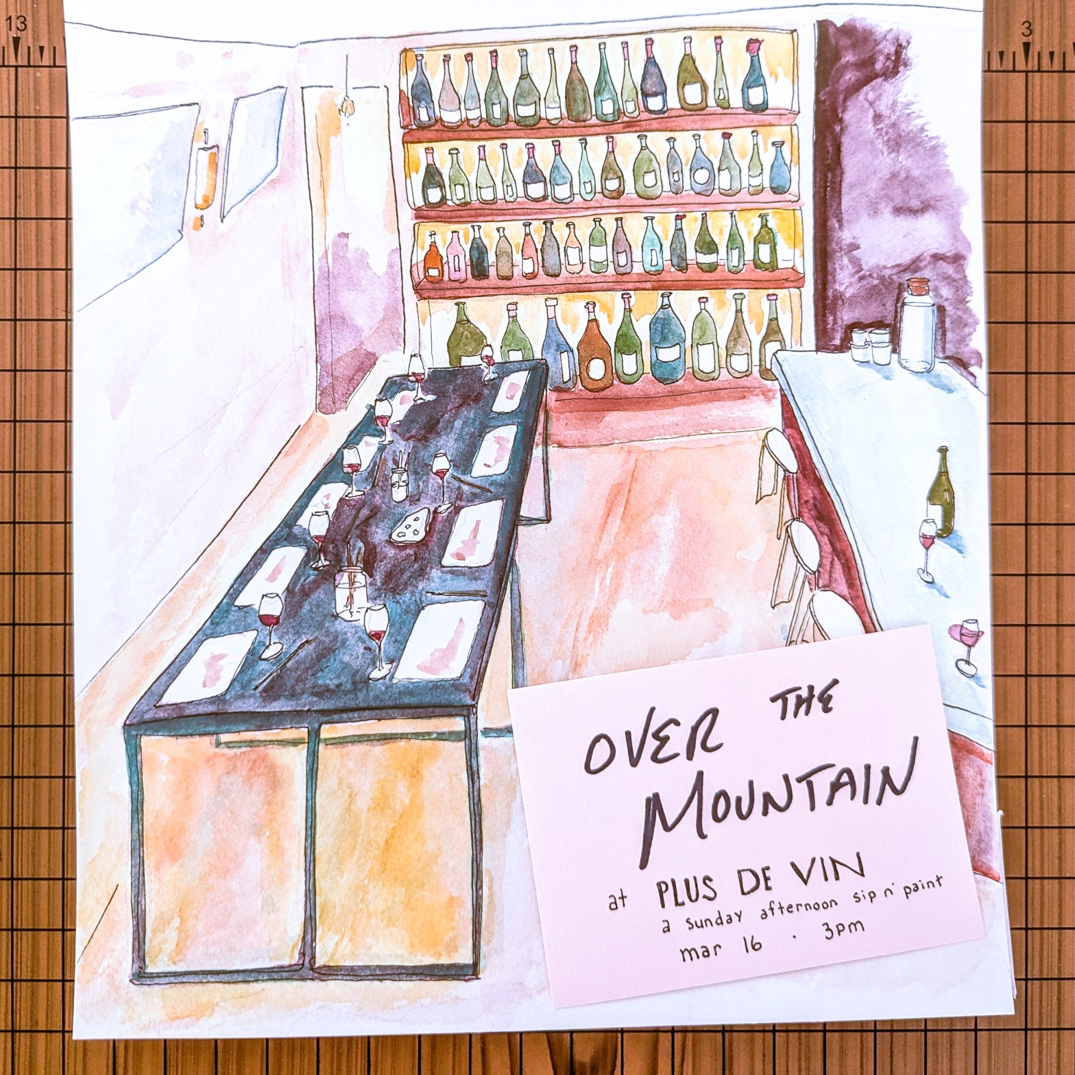 A sip n’ paint at Plus de Vin, a wine bar off the Graham Ave L stop in Brooklyn, held on March 16. Upcoming classes: Sunday afternoon, April 20 [tickets] and May 11 [tickets]