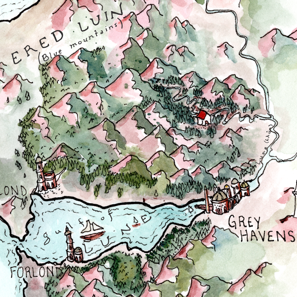 The place Dramatic river valleys carved into the coastal Blue Mountains (Ered Lindon). Vines cling to steep slate terraces, some thousands of years old, some now lost beneath the water where the level of the river has been changed. The seaport of the Grey Havens (Mithlond), where Elvish ships set sail for Valinor, is an important trading hub and market for local wines. Steep inland valleys make for more extreme swings between heat and cold than in the rest of this rainy, green region.