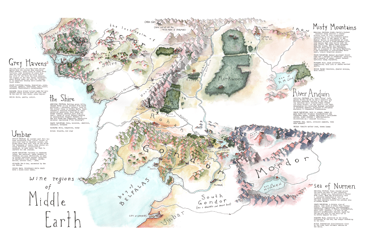What wines do they grow in the Shire? What’s in the casks that barges carry upriver on the rushing Anduin? What is the terroir imprint of the volcanic soils of Mt. Doom?